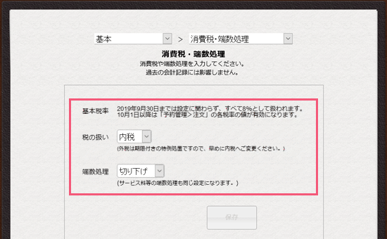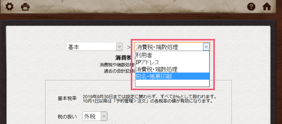 画面上部の右のボタンをクリックして、「消費税・端数処理」を選択してください。