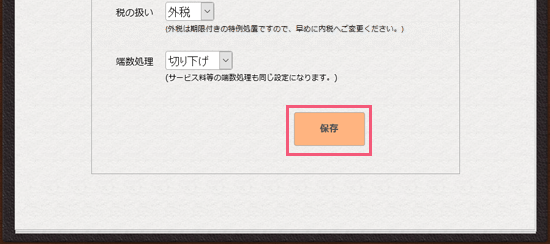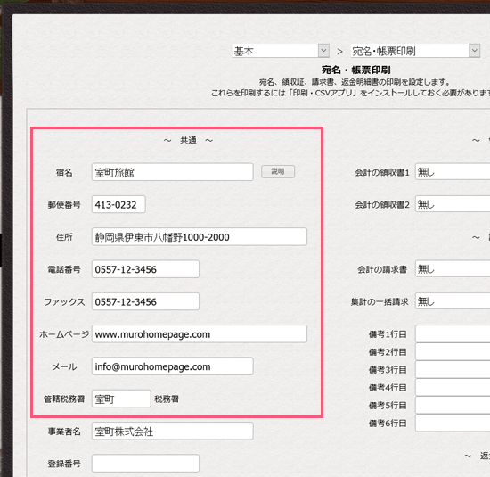 画面左の方の宿名、住所、電話番号などを入力してください。印刷時に印字されます。