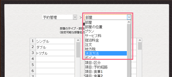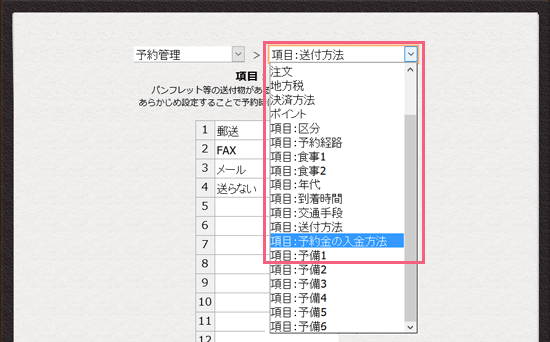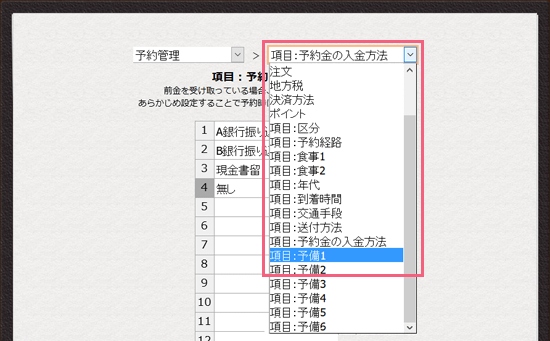 画面上部の右のボタンをクリックして、「項目:予約金の入金方法」を選択してください。