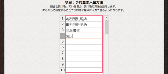 「予約金の入金方法」は、予約の際、お客様に予約金をお願いしている場合、その受け取り手段について予約台帳上でメモします。