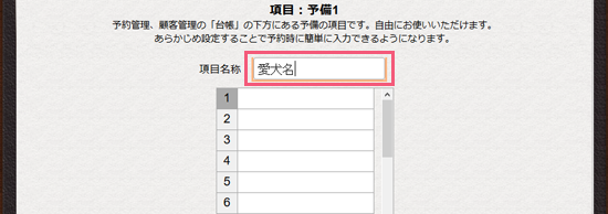 「予備」は、予約台帳上でほかにもメモしたいことがあれば、項目をつくることができます。