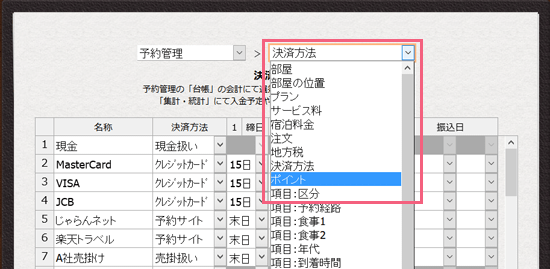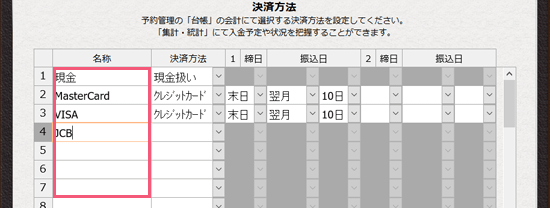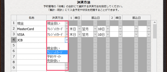 入力した各方法が具体的に「現金扱い、クレジットカード、予約サイト、売掛扱い」のどれであるかを選択してください。