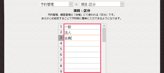「区分」は、予約が飛び込みであるか、通常の予約か。あるいは、顧客台帳にも予約者を登録して、シルバー会員、ゴールド会員などに分けることができます。