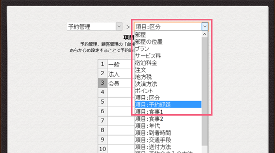 画面上部の右のボタンをクリックして、「項目:予約経路」を選択してください。