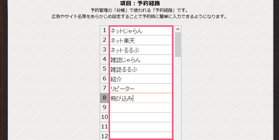 「予約経路」は、予約者がどのサイトから予約したか、どの広告を見て電話予約をしたかなど、予約に至る経緯を予約台帳上でメモします。