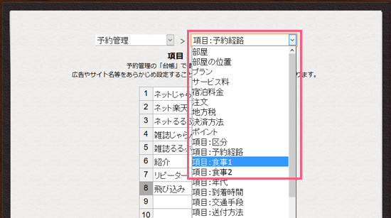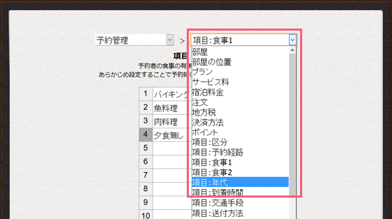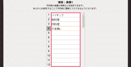 「食事1、食事2」は、夕食・朝食の有無や、料理内容を予約台帳上に記録します。