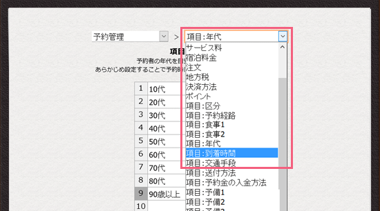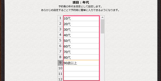 「年代」は、予約者の年齢を予約台帳上でメモします。