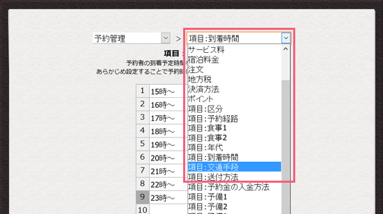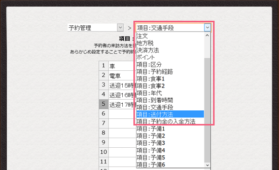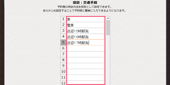 「交通手段」は、宿泊者がお越しになる交通機関を予約台帳上でメモします。