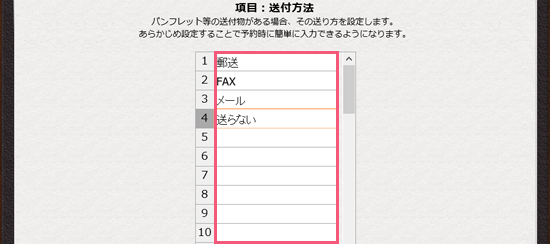 「送付方法」は、予約の際、お宿までの地図や予約確認書などを送付している場合、その送り方について予約台帳上でメモします。