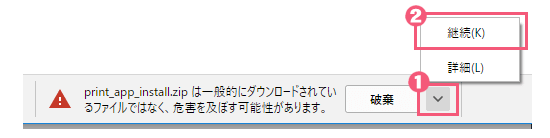 画像のようなものが表示されたら「v」をクリックし、メニューから「継続」をクリックしてください。