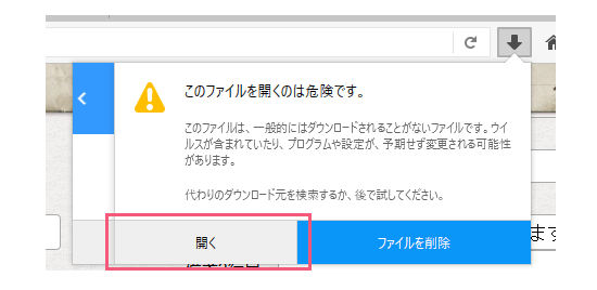 しばらくして画面下方が画像のようなものに変わりましたら、「開く」をクリックしてください。