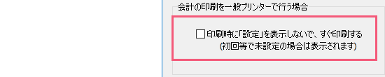 一般的なインクジェットプリンター等の場合は、印刷前に必ず、設定画面が表示されますが、このチェックを入れるとお会計時に限り、表示させないですぐに印刷することができます。