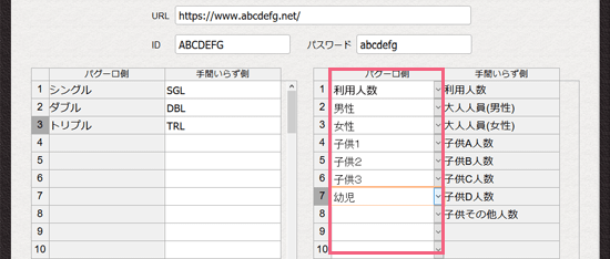 パグーロ側の各人数区分を選択し、サイトコントローラーの人数区分と組み合わせください。
