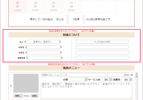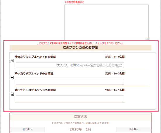 下の方へスクロール移動をすると、各お部屋に関する、簡単な料金説明ができますので入力してください。