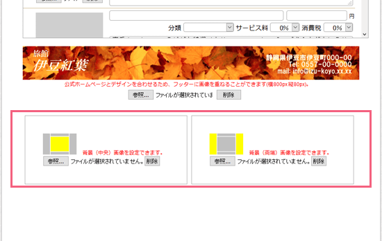さらに下の方へスクロール移動をすると、ホームページのデザインと統一感を持たせるため、背景の画像を設定することができます。色のみを設定したい場合は、お好み色の小さな画像をご用意ください。