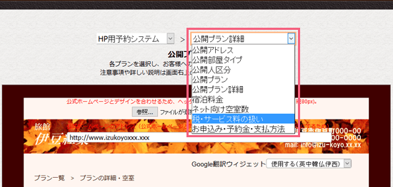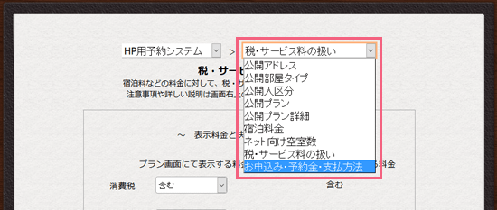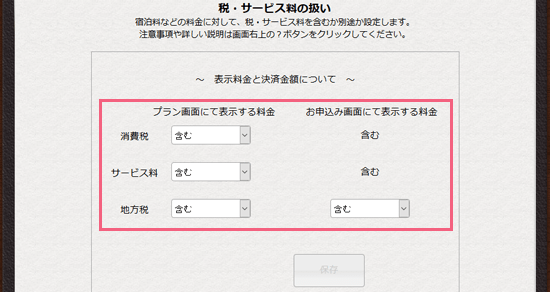 税・サービス料をプランのご案内の段階で料金表示に含めるか否か、地方税をお申込み画面でご請求に含むか否かを設定してください。含まない分は現地でいただくことになります。