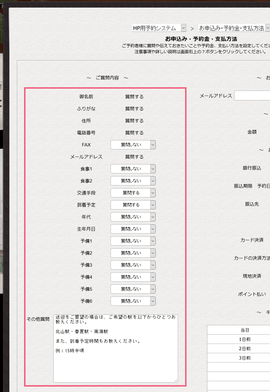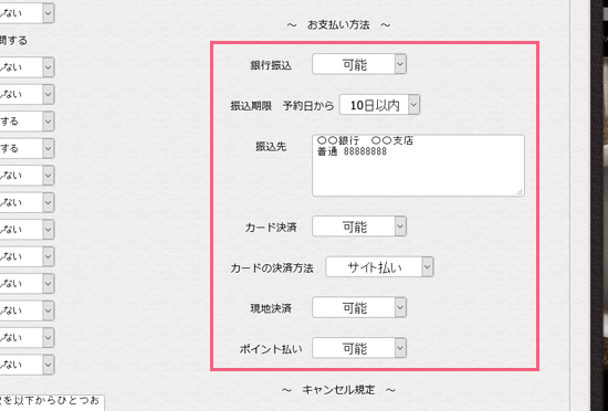 銀行振込・カード決済・現地決済・ポイント支払いをそれぞれ可能にするか設定してください。