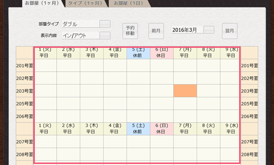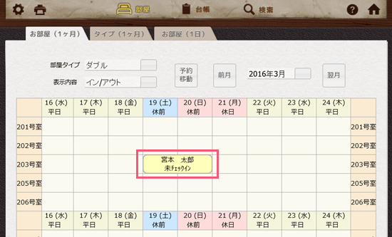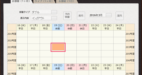 「203号室」と「19日」が交差するマスをクリックしてください。