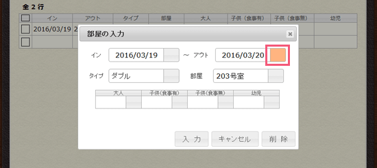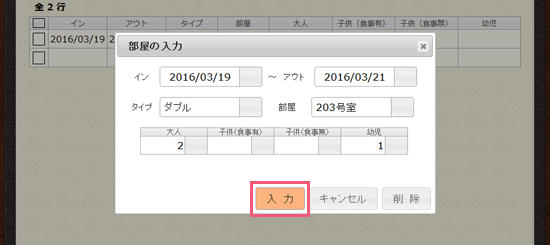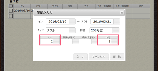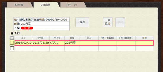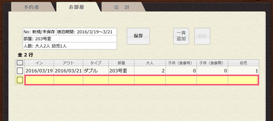 2部屋予約する場合は、下の空いている行をクリックして、同様に入力してください。