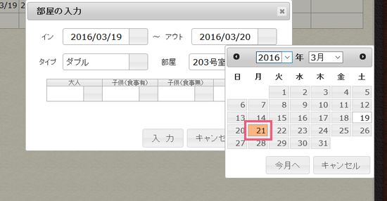 (駒は、宿泊する日を表示しているため、20日までになっていますが、チェックアウトは21日を意味しています。)