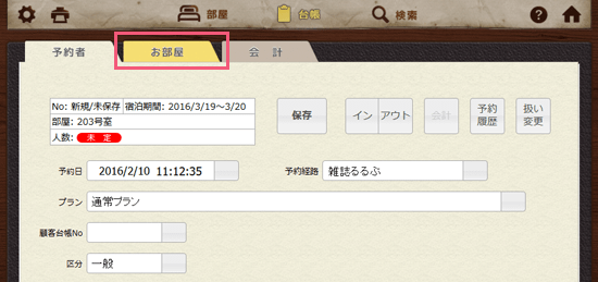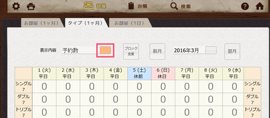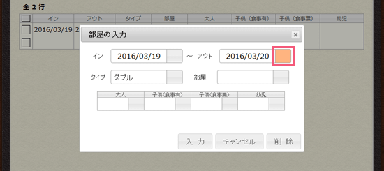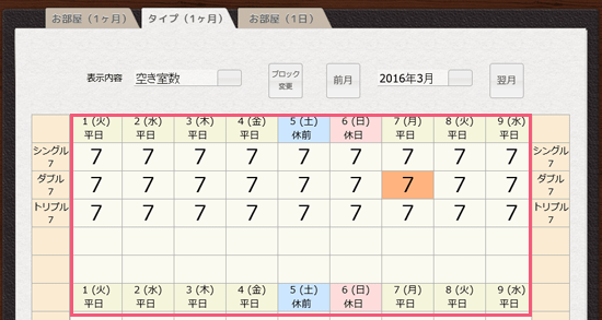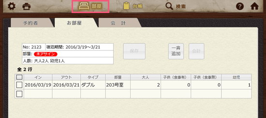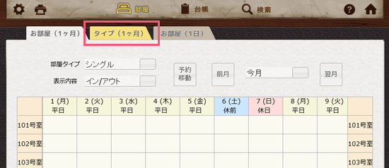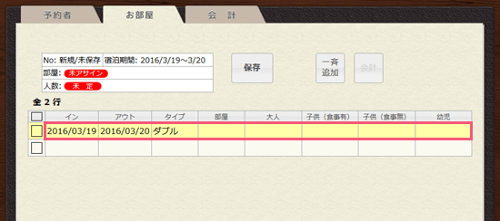 また、日付の右に「未アサイン」と赤くあるのは、部屋名が決定していない予約があるという意味です。