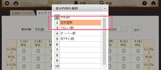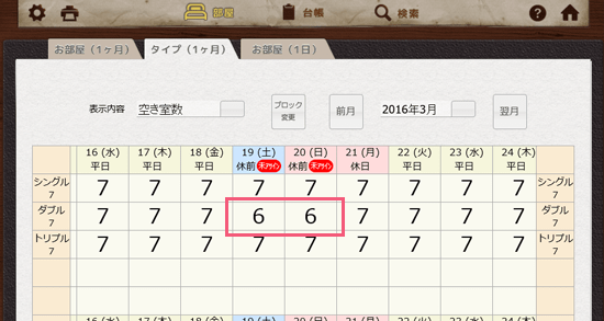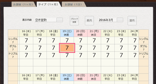 「ダブル」と「19日」が交差するマスの数字は空き室の数です。