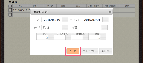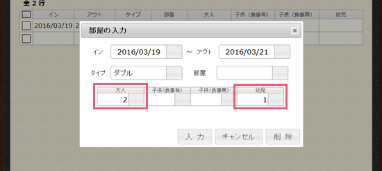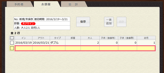 2部屋予約する場合は、下の空いている行をクリックして、同様に入力してください。