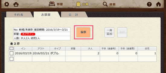 部屋を割り当てるときは、再度、予約台帳を開いて入力する方法と、部屋の予約状況一覧にて【宿泊する部屋を割り当てる】方法があります。