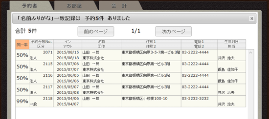 表示された内容は、同じフリガナのお客様を検索した結果です。