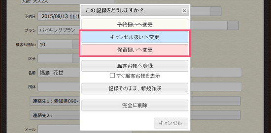 予約がキャンセルになった場合や、保留扱いになった場合に予約を削除せずに、予約扱いを変えて残しておくことができます。