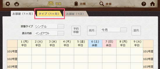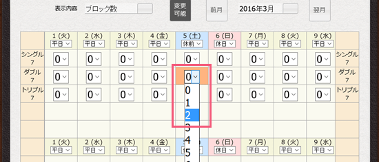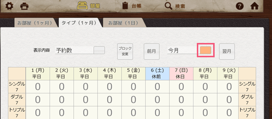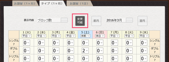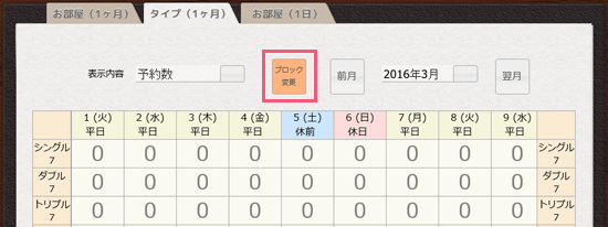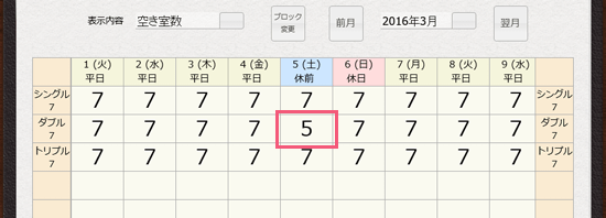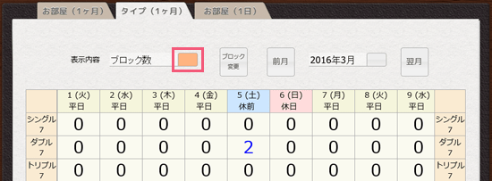 日付とタイプが交差する各数値はブロック数(受けない部屋数)です。