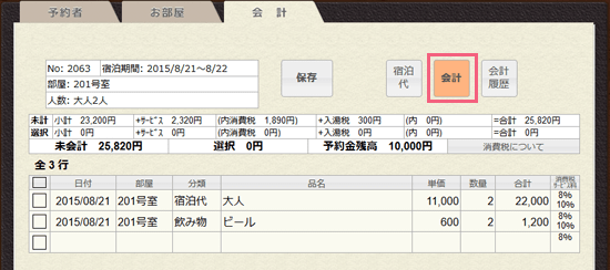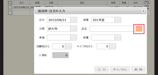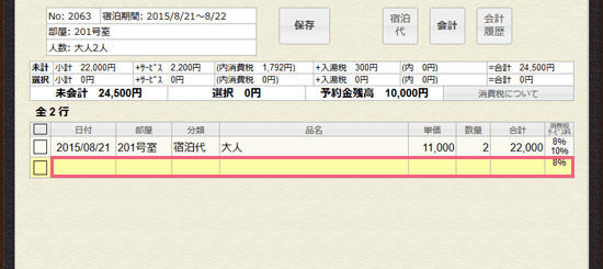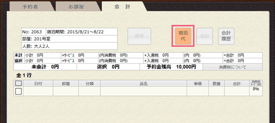 「宿泊代」ボタンをクリックし、宿泊料金を明細に加えます。
