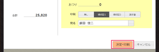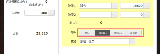 手順.18にて「領収書、請求書」を選択した場合は、帳票が印刷され、「無し、領収書」を選択した場合は、台帳の保存が自動で行われ、会計内容も会計履歴へ自動で保存されます。