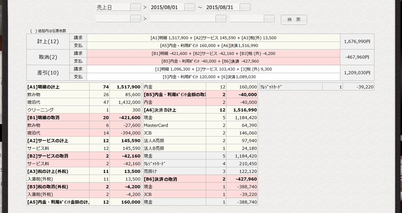背景が薄い黄色の行は、売上です。赤い行は取り消されたものです。