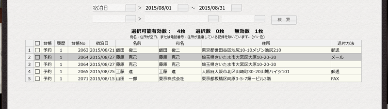 予約管理の台帳の「DM印刷可」にチェックが入っている連絡先が一覧表示されます。