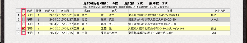 グレー色の行は、重複している連絡先、または住所等が空白で宛名として不十分な連絡先です。