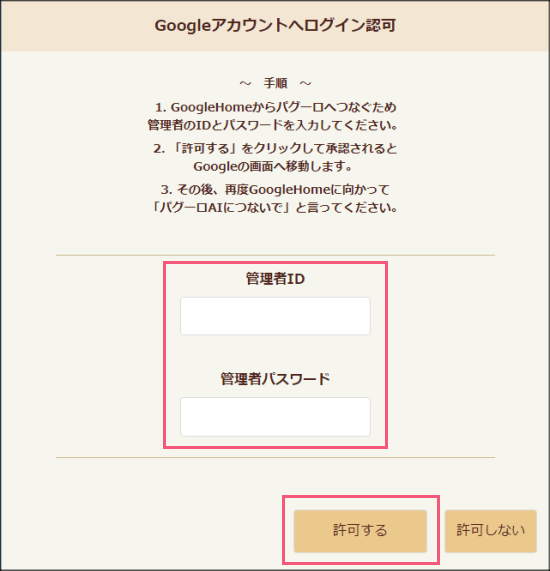 「Googleアカウントへログイン認可」という画面が開いたら、パグーロの管理者IDとパスワードを入力して、「許可する」をタップしてください。