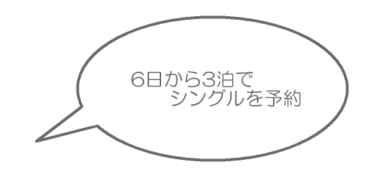 「6日から3泊でシングルを予約」のように言うと、「2018年12月6日から3泊で、シングルを予約しました。」のように返答され、予約が行えます。